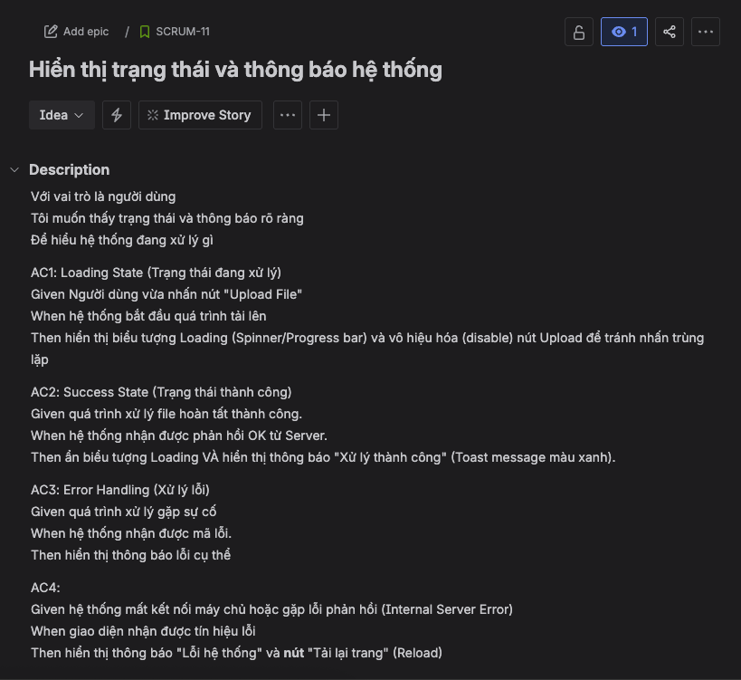 Chuẩn hóa yêu cầu nghiệp vụ thành các user story chi tiết. Acceptance criteria được xây dựng theo mô hình Gherkin (Given-When-Then) nhằm đảm bảo tính chặt chẽ về logic và tối ưu hóa việc kiểm thử.